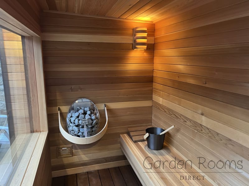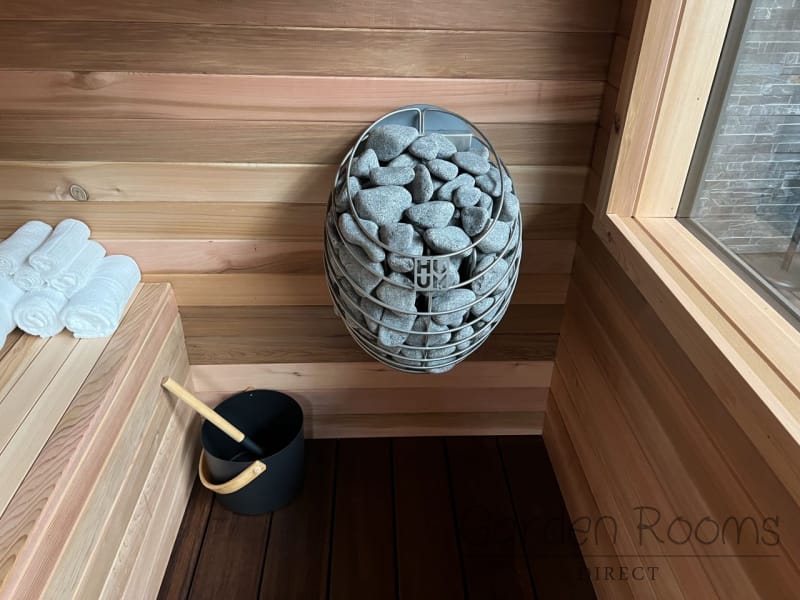 Each sauna is powered by a HUUM sauna heater, supplied with sauna stones. HUUM heaters are known for their robust construction and elegant design, delivering a smooth, gentle steam for long-term, healthy sauna use.